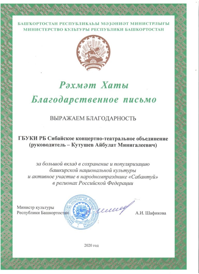 Сибай концерт-театр берекмәһе исеменә килгән рәхмәт хаттары беҙҙең артистарыбыҙҙың, ғөмүмән коллективтың эшенә ҙур баһа булып тора. Ошо көндәрҙә лә коллектив Башҡортостандың мәҙәниәт министры Әминә Шафиҡова һәм Ленинград өлкәһенең Халыҡтар дуҫлығы йорто етәкселегенән рәхмәт хаттарын алды.