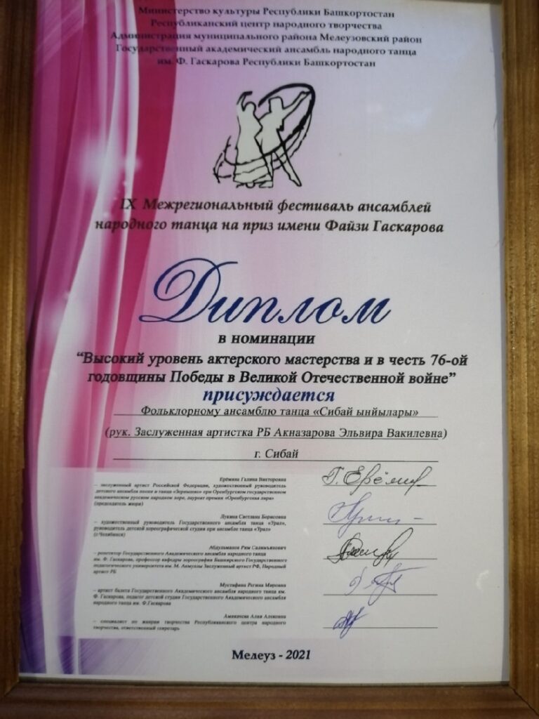 Среди 21 коллектива принял участие и фольклорный ансамбль “Сибай ынйылары” Сибайского концертно-театрального объединения. Руководитель ансамбля – заслуженный артист РБ Эльвира Акназарова. Коллектив представил два танца: старинный гаскаровский танец с ведром и “Тол ҡатындар” (постановка Г. Акназаровой). Не осталось ни одного зрителя, которого не тронул танец “Тол ҡатындар”, за который ансамбль был удостоен диплома в номинации “За высокий уровень актёрского мастерства и в честь 76 – ой годовщины Победы в Великой Отечественной войне”.