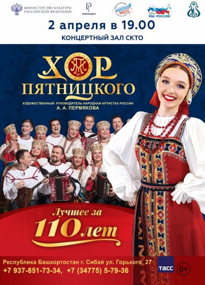 2 апреля в 19.00 в новом, обновленном Большом зале Сибайского концертно-театрального объединения состоится концерт Хора Пятницкого под руководством народной артистки России Александры Андреевны Пермяковой. Хор востребован, он гастролирует по всей стране – от Подмосковья до Сибири. Русская песня понятна всем, независимо от национальности. Прекрасные старинные русские песни, красивые костюмы и танцы оставят в ваших сердцах неизгладимый след.