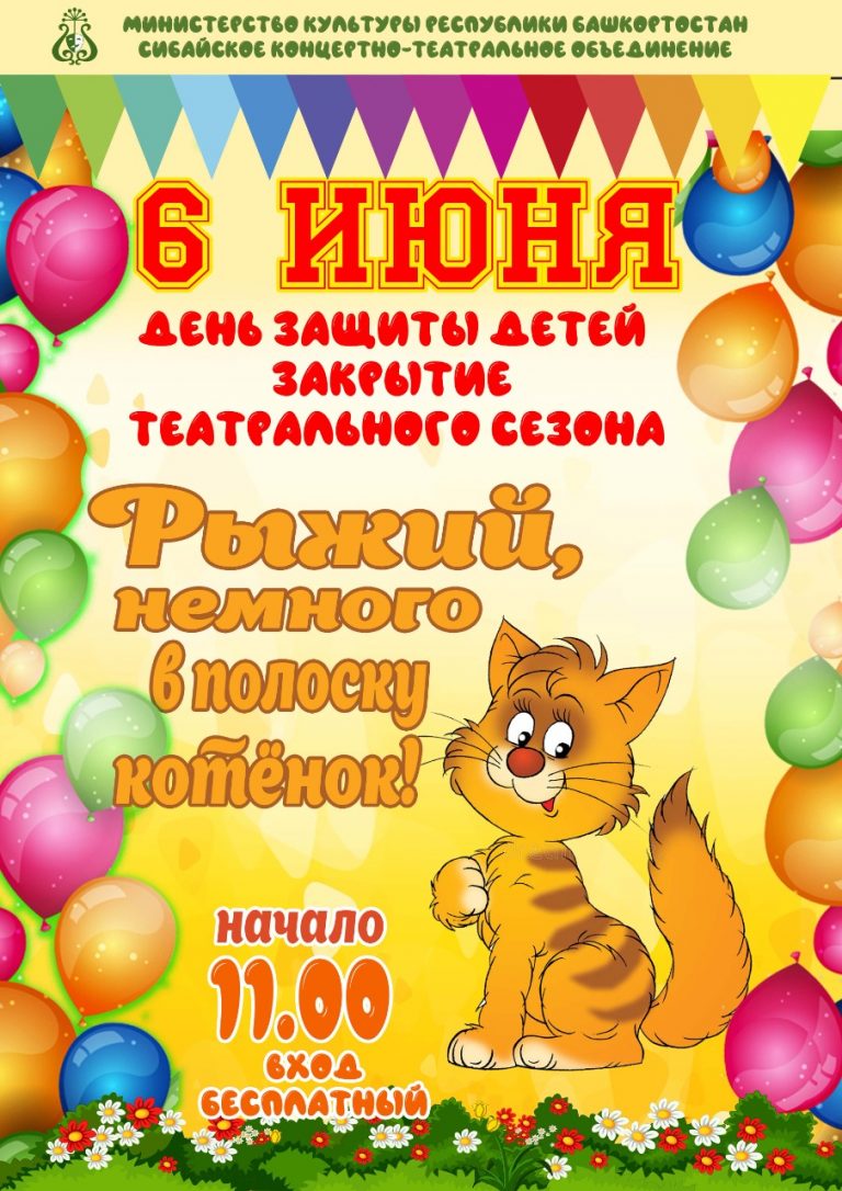 Детский театр “Сулпан” Сибайского концертно-театрального объединения закрывает свой творческий сезон и приглашает на постановку “Рыжий, немного в полоску котёнок!”. Благотворительный спектакль посвящен Международному дню защиты детей! Ждем детей и их родителей!