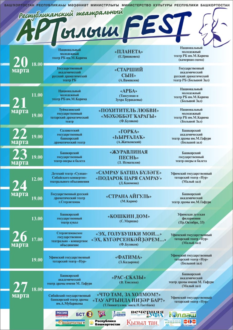 20-27 мартта Башҡортостанда «AРTылышFEST» республика театр фестивале үтәсәк. Программала Башҡортостандың төп театр коллективтарының иң яҡшы постановкалары тәҡдим ителгән. Форумда Өфө, Салауат, Стәрлетамаҡ, Сибай, Туймазы ҡалаларынан 12 профессиональ театр ҡатнаша. Ете фестиваль көнө буйына Өфөнөң төп мәҙәни майҙансыҡтарында төрлө аудиторияға – балаларға, йәштәргә, өлкәндәргә иҫәпләнгән 13 спектакль күрһәтелә. Форум барышында «Башҡортостан театрҙары: үҫеш юлдары» түңәрәк өҫтәле…