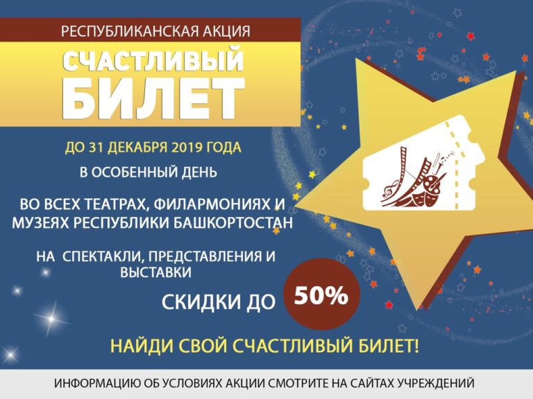 В рамках республиканской акции «Счастливый билет» был проведен розыгрыш пригласительных билетов на концерты Сибайского концертно-театрального объединения 5 и 11 декабря. Поздравляем победителей конкурса!!! 5 декабря – концерт «Милли ризыҡ – тәнгә шифа, йыр-моңдары йәнгә шифа» – Альфия Матинова и Миляуша Хамитова 11 декабря – музыкальная драма «Славные сыны Отчизны» («Батырҙарҙы данлар илем бар») – Татьяна…