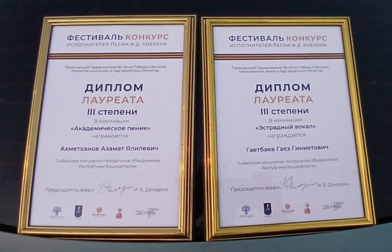 Солисты Сибайского концертно-театрального объединения достойно представили наше учреждение на конкурсе-фестивале патриотической песни имени Иосифа Кобзона. Наши вокалисты прошли отборочный этап и стали Лауреатами III степени – заслуженный артист Республики Башкортостан Гаяз Гаетбаев в номинации “ЭСТРАДНЫЙ ВОКАЛ” и Азамат Ахметханов в номинации “АКАДЕМИЧЕСКОЕ ПЕНИЕ”. Поздравляем наших коллег и желаем новых творческих высот и вдохновения!